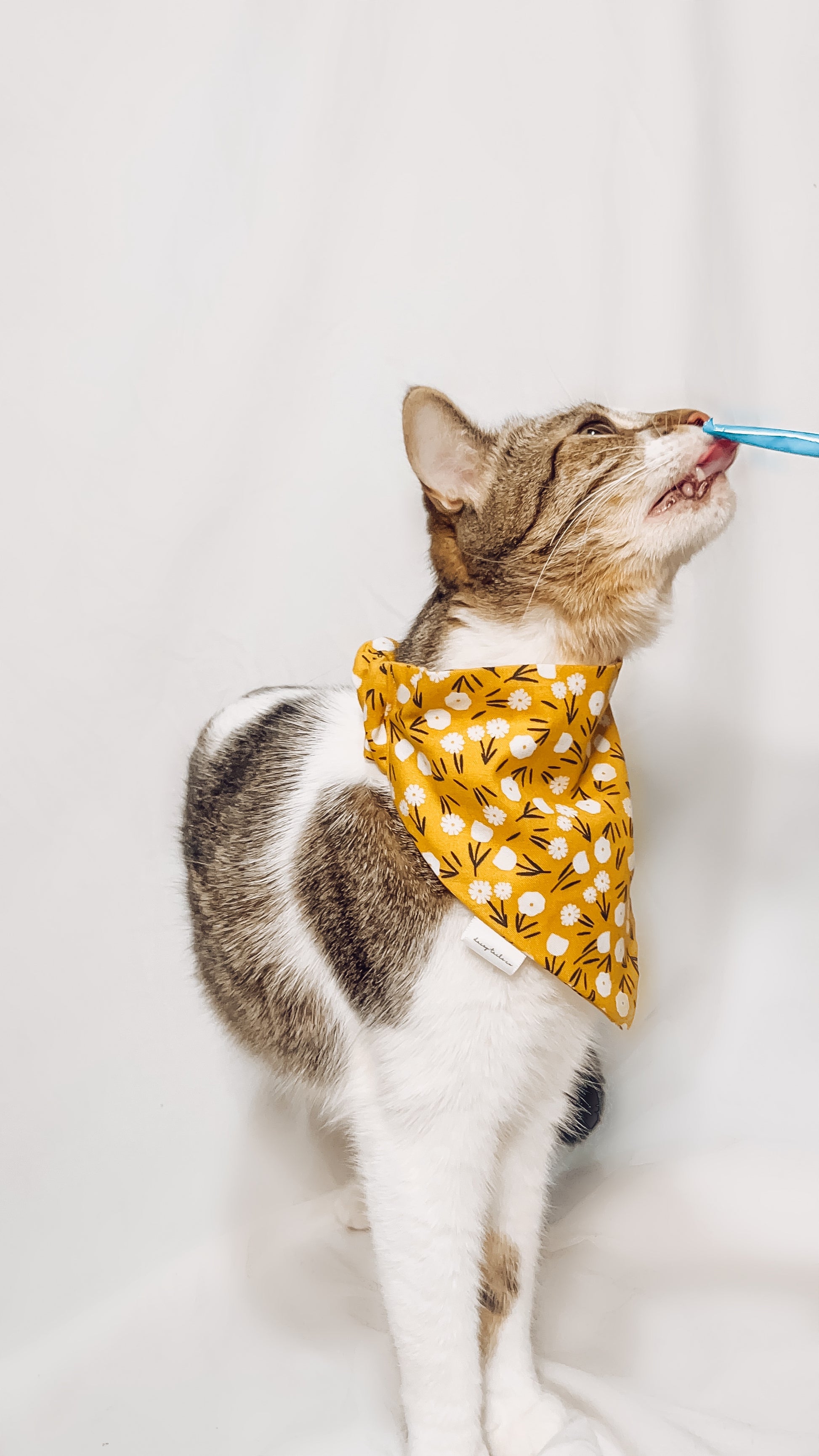 Bring a little sunshine to your pet’s wardrobe! Our Yellow Floral Pet Bandana is machine-sewn with love and crafted for everyday comfort. The bright floral pattern adds a cheerful pop of color, while the unique scrunchie-style back makes it incredibly easy to slip on and off—no tying, no fuss!