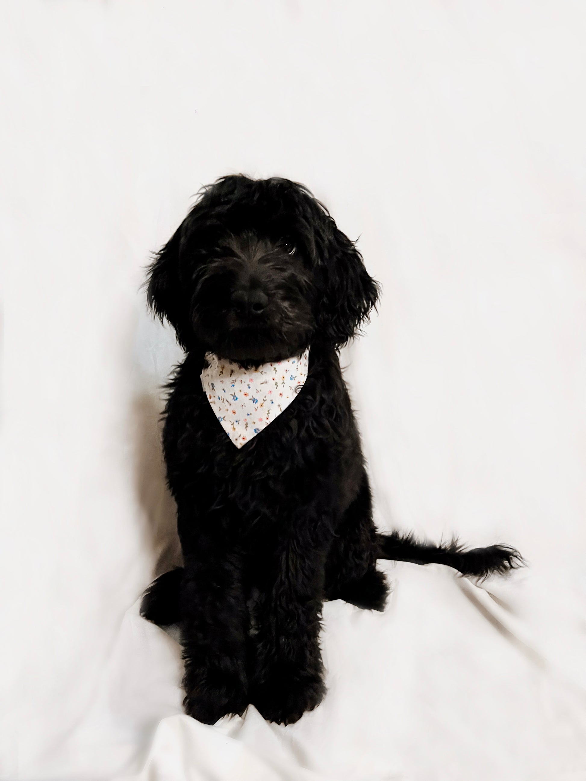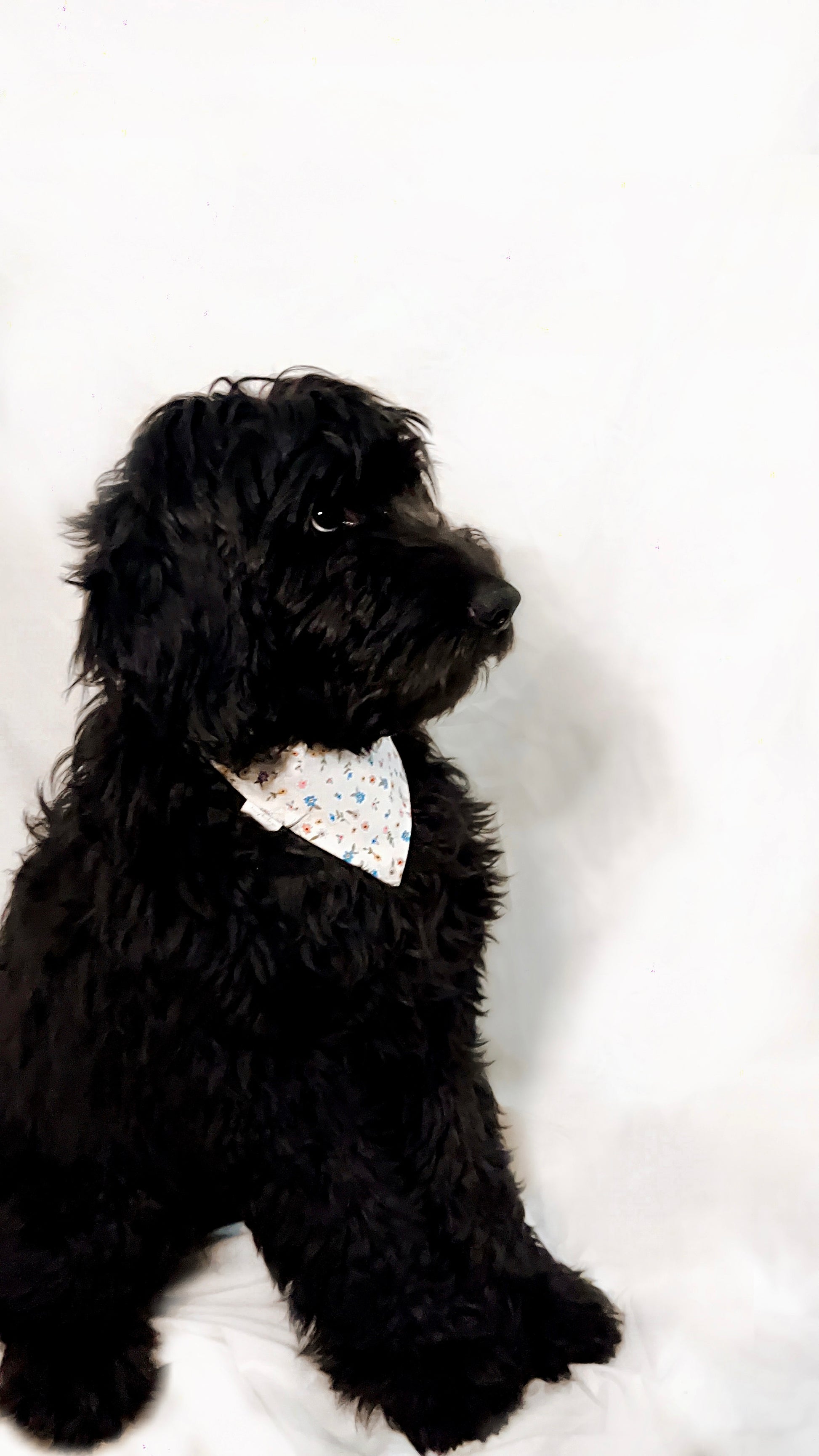 Sweet, soft, and impossibly cute—our White Pastel Flower Pet Bandana is the perfect way to add a gentle pop of color to your pet’s everyday look. Made with love and machine-sewn for durability, this bandana features tiny multicolored flowers on a crisp white background for a subtle, charming style. And thanks to the stretchy scrunchie-style back, it slips on and off effortlessly—no tying required!